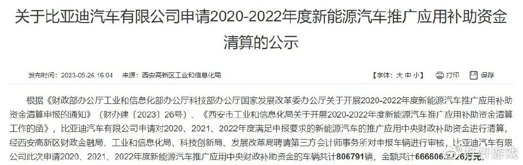 日前,西安市工信局发布了《关于比亚迪汽车有限公司申请2020-2022年度新能源汽车推广应用补助资金清算的公示》。