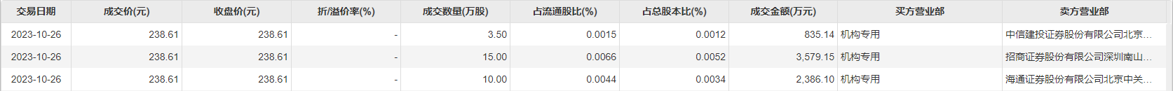 今日大宗交易成交28.5万股,成交额6800.39万元,占当日总成交额的3.76%,成交价238.61元,较市场收盘价持平。