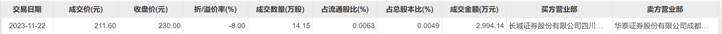 今日大宗交易成交14.15万股,成交额2994.14万元,占当日总成交额的1.21%,成交价211.6元,较市场收盘价折价8%。