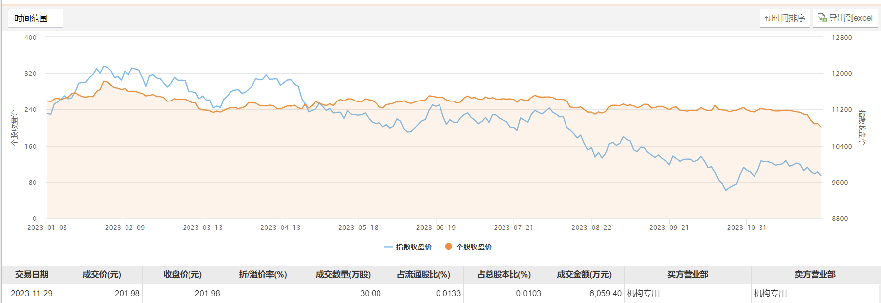 今日大宗交易成交30万股,成交额6059.4万元,占当日总成交额的1.34%,成交价201.98元,较市场收盘价持平。