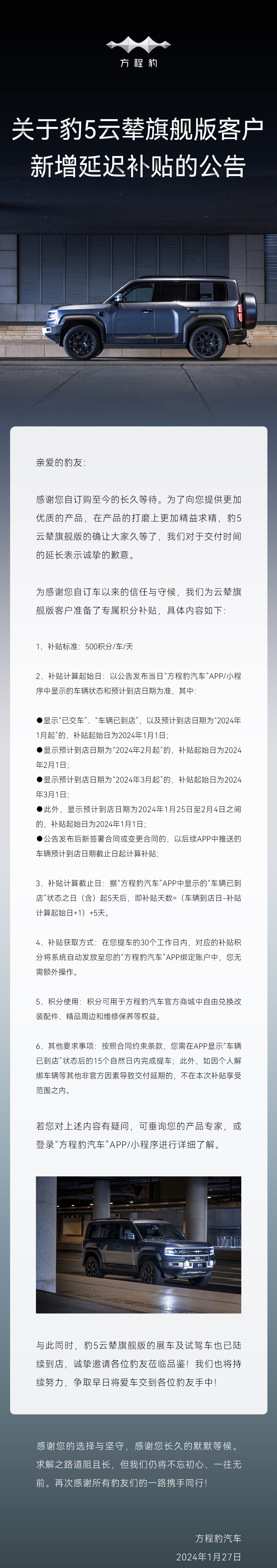 方程豹汽车发布公告,针对豹5云辇旗舰版的交付延迟深感抱歉,并为此准备专属积分补贴,补贴标准为每车每天500积分。