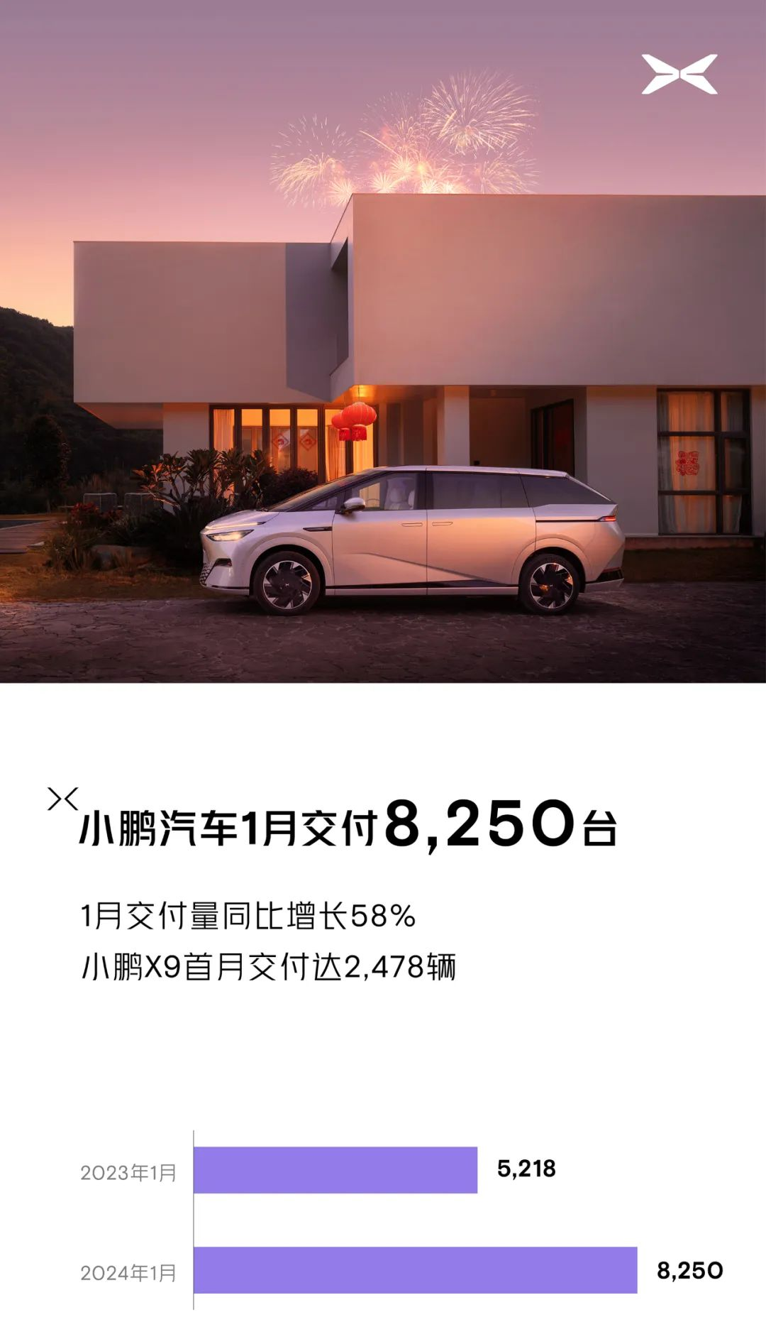 2月1日,小鹏汽车公布最新交付成绩。2024年1月,小鹏汽车共交付新车8,250台,同比增长58%。