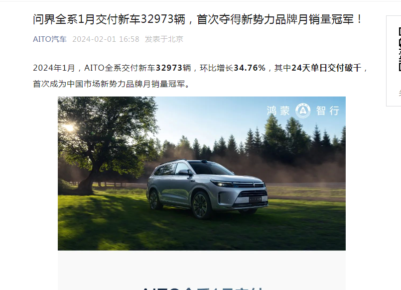 值得注意的是,2024年1月,问界全系交付新车32973辆,环比增长34.76%,其中24天单日交付破千,首次成为中国市场新势力品牌月销量冠军。