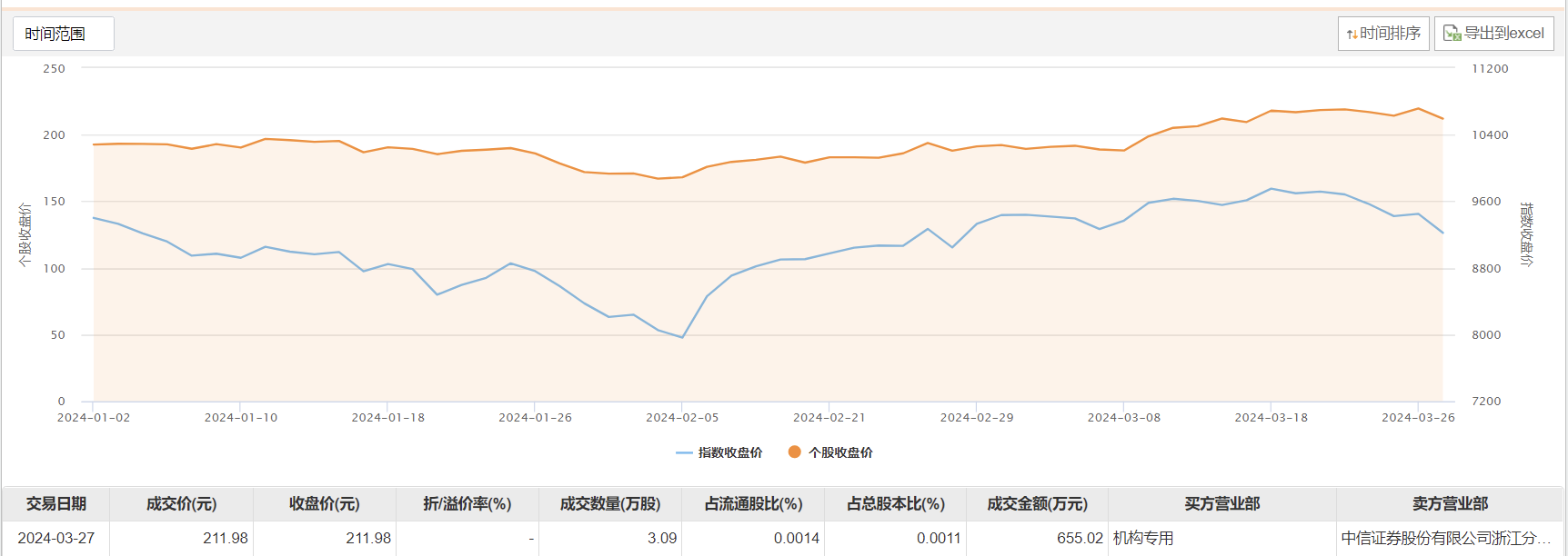 今日大宗交易成交3.09万股,成交额655.02万元,占当日总成交额的0.16%,成交价211.98元,较市场收盘价持平。