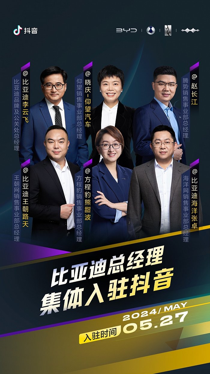宣布,比亚迪总经理集体入驻抖音平台,包括比亚迪品牌及公关处总经理李云飞,以及仰望、腾势、方程豹等销售事业部总经理。