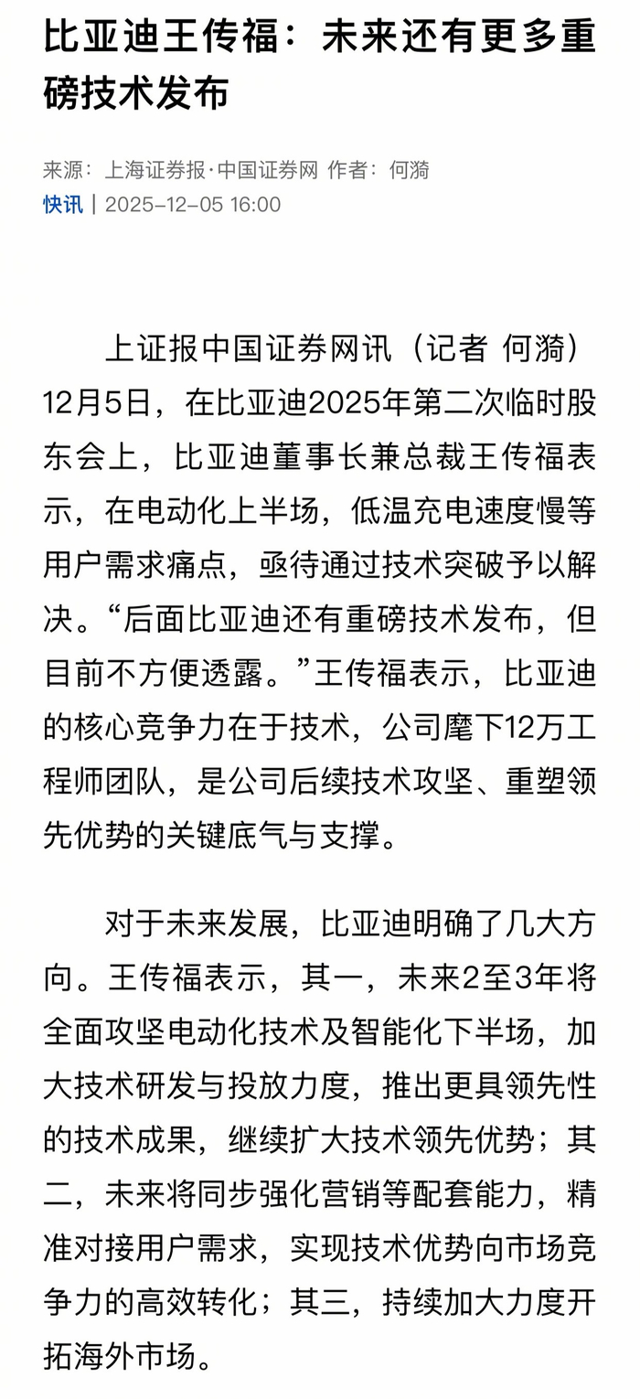 【#王传福称比亚迪将加大技术研发力度#】#王传福称比亚迪还有重磅技术发布#12月5日,在比亚迪2025年第二次临时股东会上,比亚迪董事长兼总裁王传福表示,在电动化上半场,低温充电速度慢等用户需求痛点,亟待通过技术突破予以解决。“后面比亚迪还有重磅技术发布,但目前不方便透露。”王传福表示,比亚迪的核心竞争力在于技术,公司麾下12万工程师团队,是公司后续技术攻坚、重塑领先优势的关键底气与支撑。