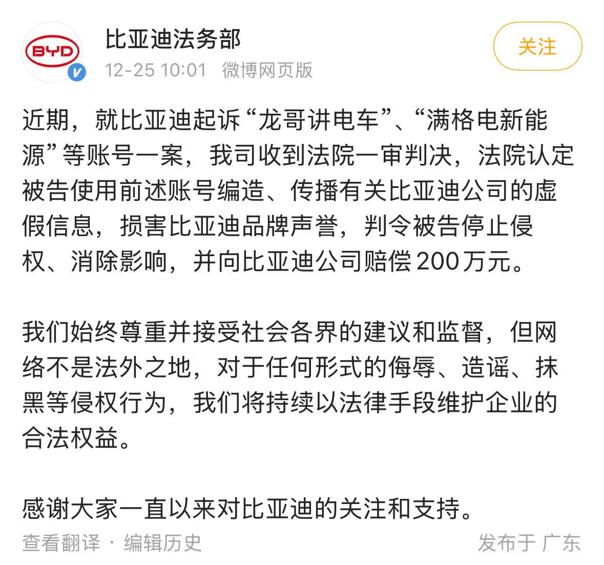 12月25日,据比亚迪(002594.SZ)法务部在官方微博发文称,近期,就比亚迪起诉“龙哥讲电车”、“满格电新能源”等账号一案,我司收到法院一审判决,法院认定被告使用前述账号编造、传播有关比亚迪公司的虚假信息,损害比亚迪品牌声誉,判令被告停止侵权、消除影响,并向比亚迪公司赔偿200万元。