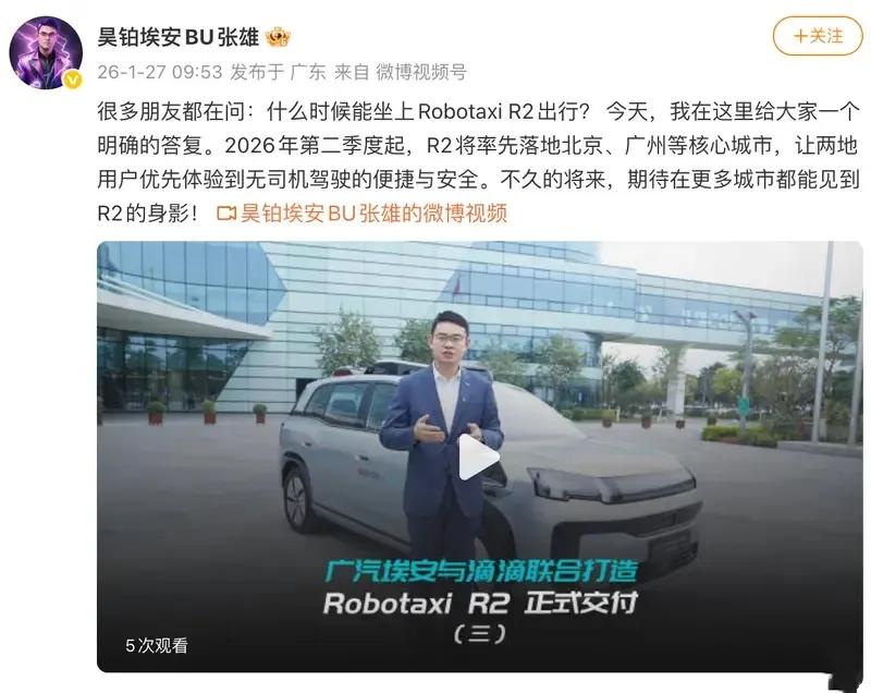 今日,昊铂埃安BU总裁张雄发文称,2026年第二季度起,Robotaxi R2将率先落地北京、广州等核心城市。据悉,该车由广汽埃安与滴滴自动驾驶联手打造,新车已于1月23日量产交付。