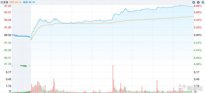 3月2日比亚迪(002594.SZ)股价仅以开盘小幅下跌1.48%回应了昨日的销量下滑,随后其股价快速拉升,上午最高涨幅一度达到4.85%至每股93.65元。午后开盘,比亚迪A股价继续震荡上行,最高涨幅达到8.87%至每股97.24元。截至当日收盘,比亚迪A股股价涨幅达8.36%,每股股价96.79元。