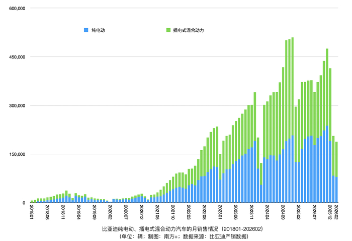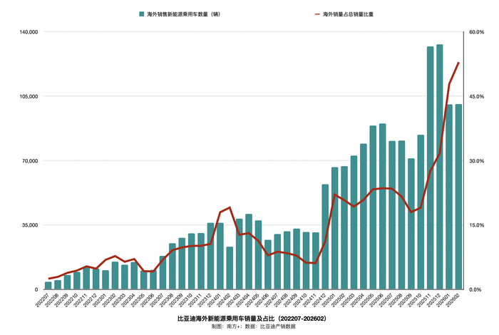 南方+统计,数据显示,2025年9月以来,比亚迪出口销量比重持续走高,2026年2月汽车出口销量比重首月过半。