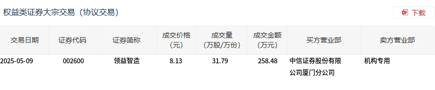 领益智造今日大宗交易平价成交31.79万股,成交额258.48万元