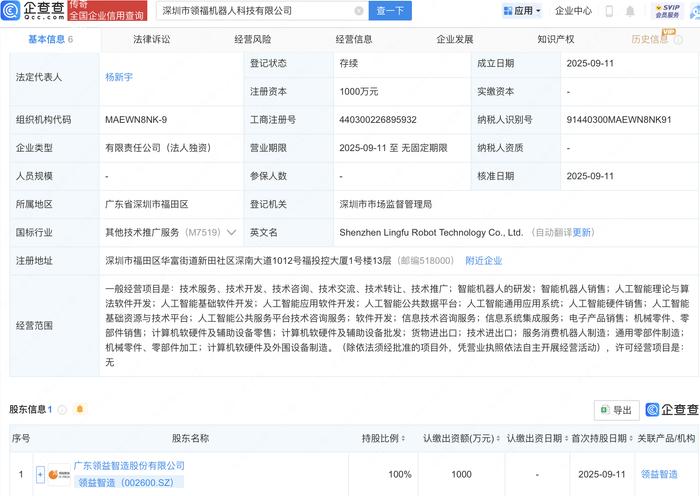 企查查APP显示,近日,深圳市领福机器人科技有限公司成立,注册资本1000万元,经营范围包含:智能机器人的研发;智能机器人销售;人工智能应用软件开发;人工智能公共数据平台;人工智能通用应用系统等。企查查股权穿透显示,该公司由领益智造(002600)全资持股。