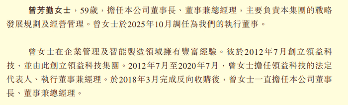 领益智造由曾芳勤创办,2018年通过反向收购借壳江粉磁材登陆A股。截至目前,曾芳勤及一致行动人持股58.64%,她同时担任公司董事长、董事兼总经理。