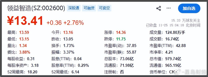 截至11月25日收盘,领益智造股价报收13.41元/股,涨2.76%,总市值达979.74亿元。