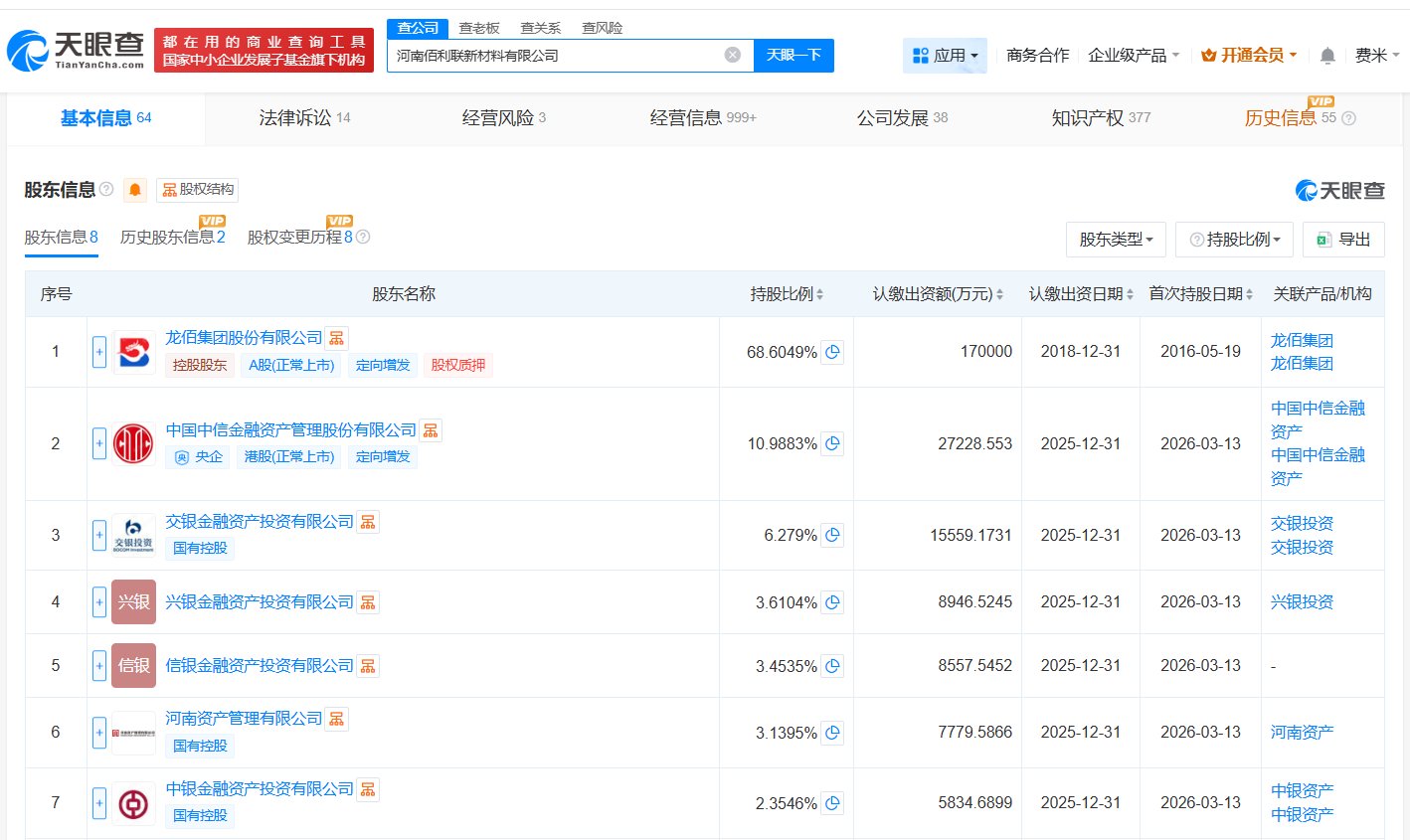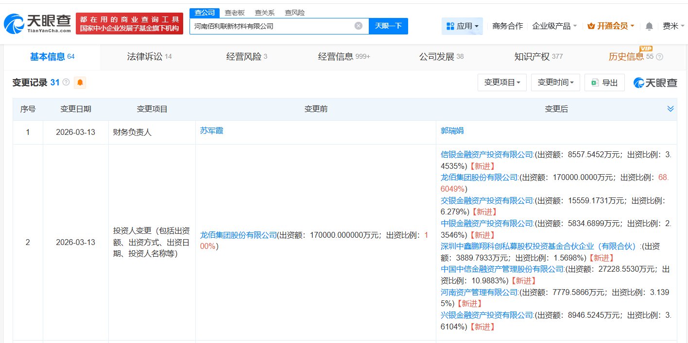 每经AI快讯,天眼查App显示,近日,河南佰利联新材料有限公司发生工商变更,新增中国中信金融资产管理股份有限公司、交银金融资产投资有限公司、兴银金融资产投资有限公司等为股东,同时,注册资本由17亿元人民币增至约24.8亿元人民币,增幅约46%。河南佰利联新材料有限公司成立于2016年5月,法定代表人为齐满富,经营范围包括化工产品生产、常用有色金属冶炼、矿物洗选加工等。股东信息显示,该公司由龙佰集团(002601)及上述新增股东共同持股。