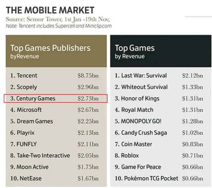扬子晚报网1月6日讯(记者 姜天圣)近日,游戏行业权威媒体Games Industry.biz整合Newzoo、Sensor Tower、ICO Partners、GfK、Circana等多家第三方市场研究机构核心数据,发布《2025年全球游戏行业报告》。报告中2025年全球手游行业发行商收入前十榜单亮点显著,共新晋4家企业。其中,世纪华通旗下Century Games表现尤为抢眼——从2024年的未上榜状态,一跃升至全球第三;其旗下策略手游《Kingshot》凭借强劲的市场爆发力,斩获“2025年全球新移动游戏收入冠军”。