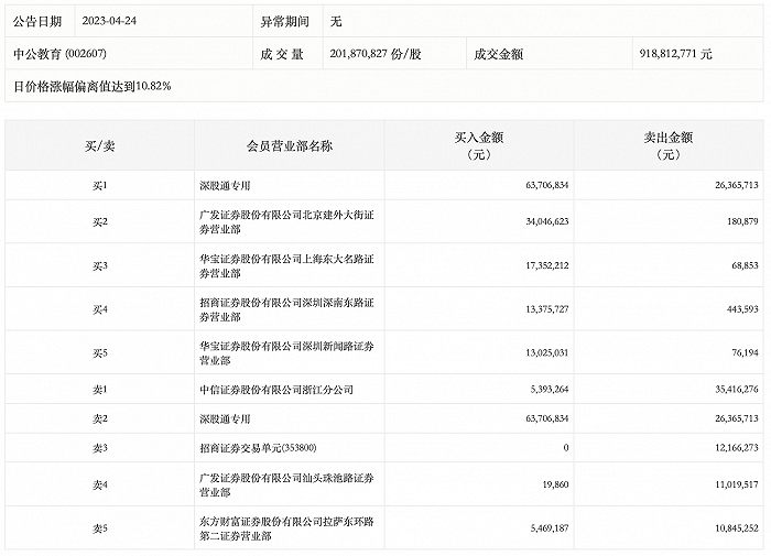 4月24日,中公教育今日涨停,龙虎榜数据显示,上榜营业部席位全天成交2.49亿元,占当日总成交金额比例为27.1%。其中,买入金额为1.52亿元,卖出金额为9658.25万元,合计净买入5580.62万元。