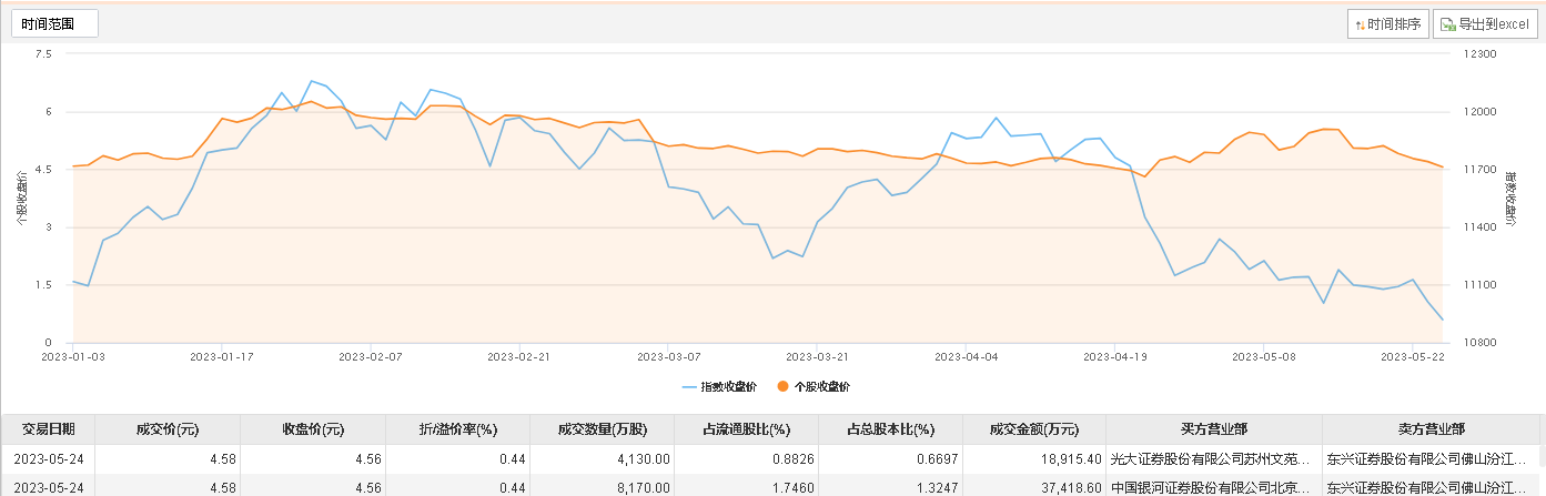 5月24日大宗交易成交1.23亿股,成交额5.63亿元,占当日总成交额的42.98%,成交价4.58元,较市场收盘价4.56元溢价0.44%。