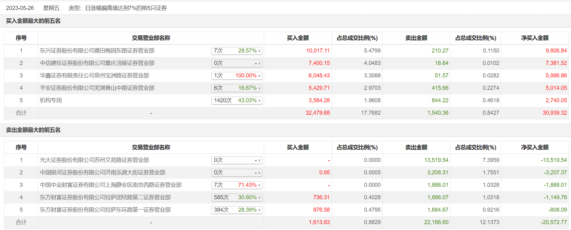 具体来看,机构买入3584.28万元,卖出844.22万元,合计净买入2740.05万元。此外,东兴证券莆田梅园东路证券营业部、中信建投证券重庆涪陵证券营业部分别买入1.00亿元、7400.15万元;光大证券苏州文苑路证券营业部、中国银河证券济南泺源大街证券营业部分别卖出1.35亿元、3208.31万元。