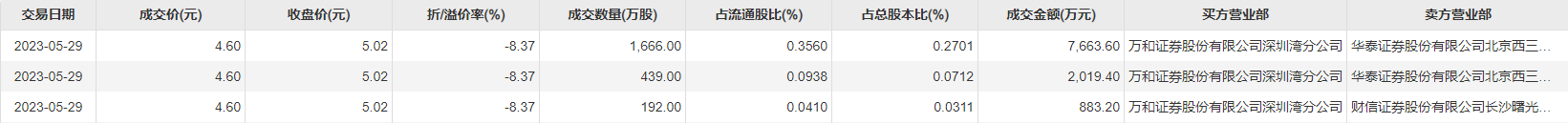 5月29日大宗交易成交2297万股,成交额1.06亿元,占当日总成交额的5.87%,成交价4.6元,较市场收盘价5.02元折价8.37%。