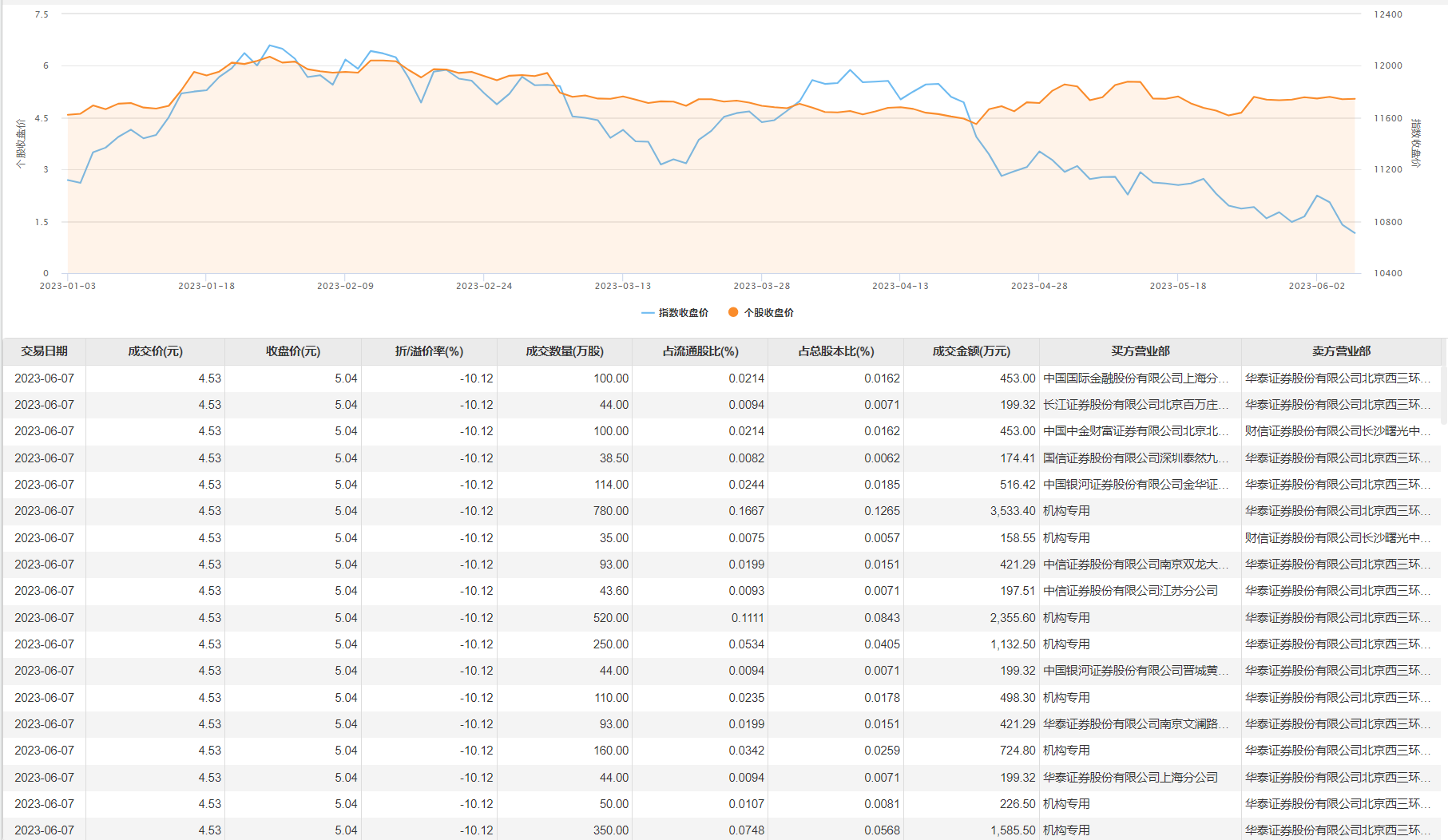 6月7日大宗交易成交2969.1万股,成交额1.35亿元,占当日总成交额的16.03%,成交价4.53元,较市场收盘价5.04元折价10.12%。