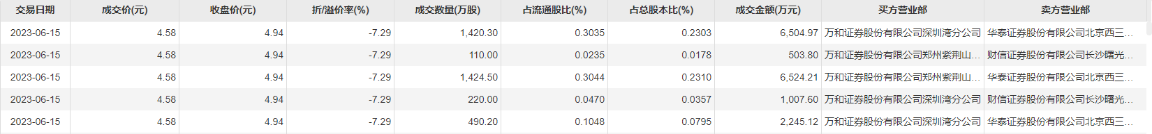 6月15日大宗交易成交3665万股,成交额1.68亿元,占当日总成交额的10.74%,成交价4.58元,较市场收盘价4.94元折价7.29%。