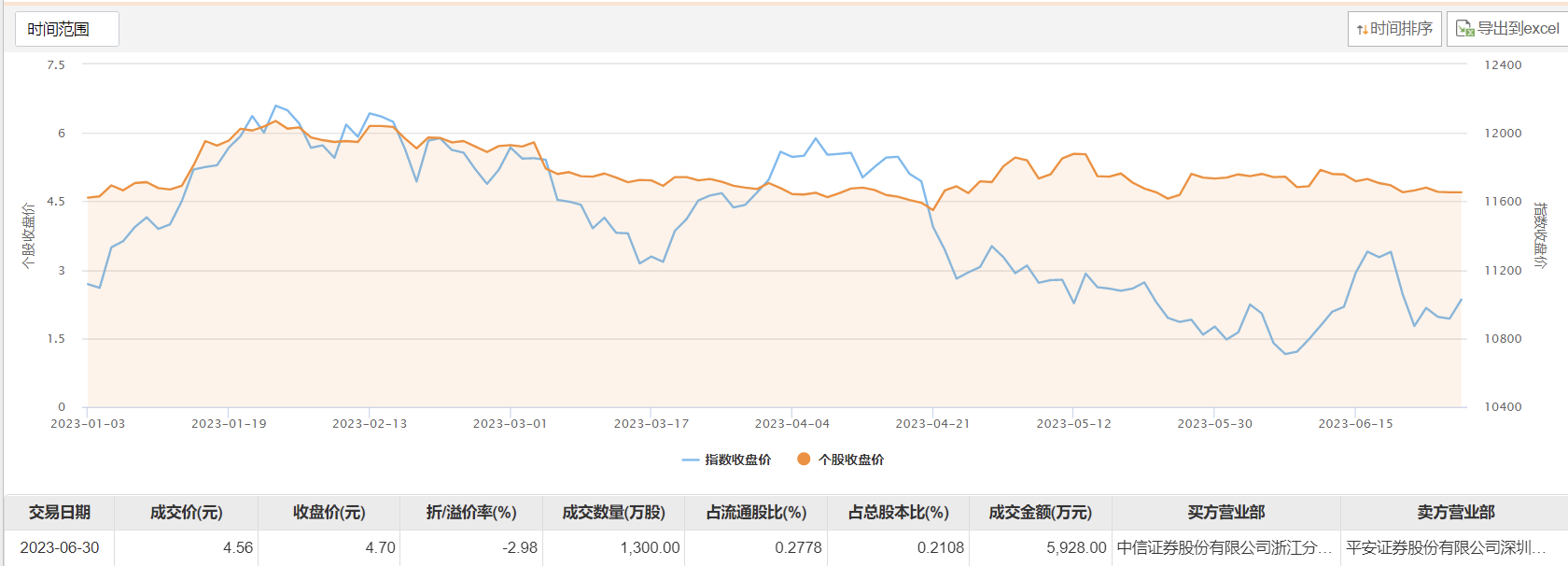6月30日大宗交易成交1300万股,成交额5928万元,占当日总成交额的11.97%,成交价4.56元,较市场收盘价4.7元折价2.98%。