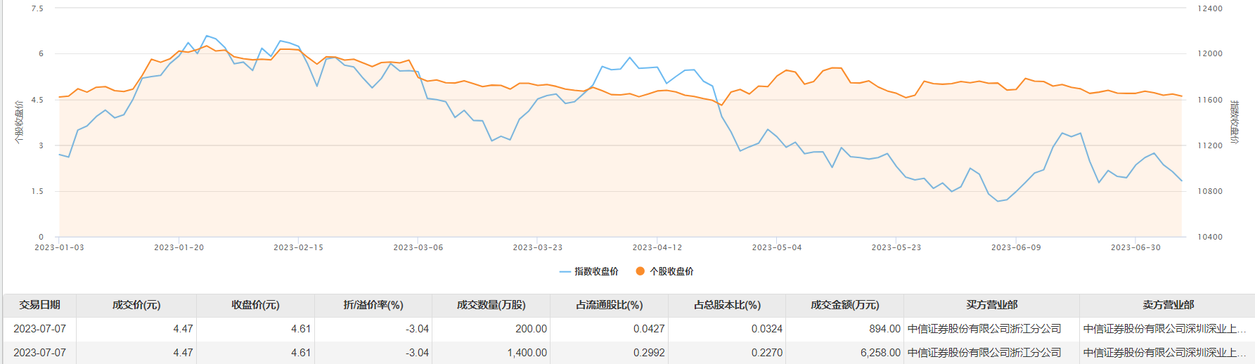 7月7日大宗交易成交1600万股,成交额7152万元,占当日总成交额的20.33%,成交价4.47元,较市场收盘价4.61元折价3.04%。
