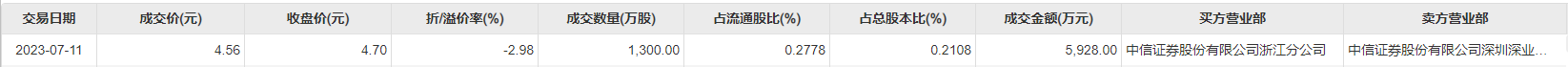 7月11日大宗交易成交1300万股,成交额5928万元,占当日总成交额的10.86%,成交价4.56元,较市场收盘价4.7元折价2.98%。