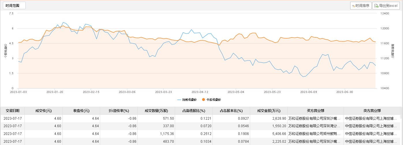 7月17日大宗交易成交2567.56万股,成交额1.18亿元,占当日总成交额的9.42%,成交价4.6元,较市场收盘价4.64元折价0.86%。