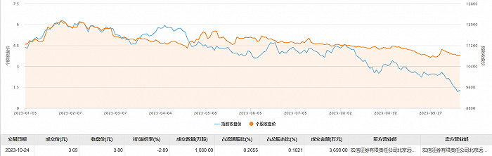 10月24日大宗交易成交1000万股,成交额3690万元,占当日总成交额的8.34%,成交价3.69元,较市场收盘价折价2.89%。