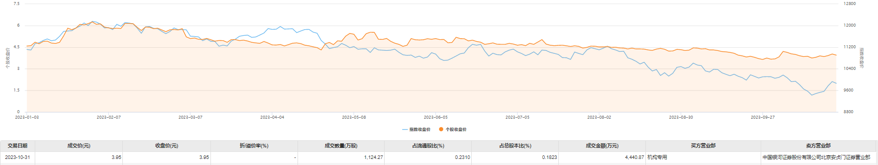 今日大宗交易成交1124.27万股,成交额4440.87万元,占当日总成交额的10.51%,成交价3.95元,较市场收盘价持平。
