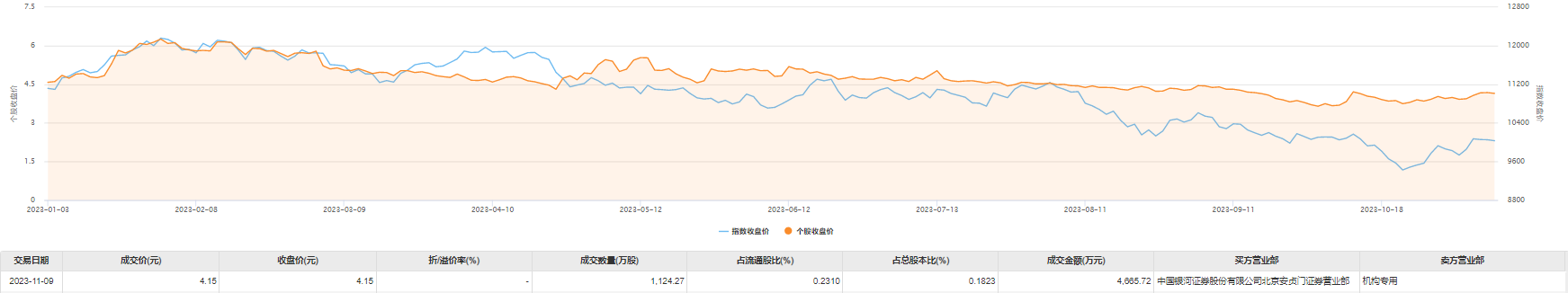 今日大宗交易成交1124.27万股,成交额4665.72万元,占当日总成交额的10.77%,成交价4.15元,较市场收盘价持平。