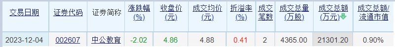 中公教育昨日大宗交易成交2.13亿元 溢价率0.41%