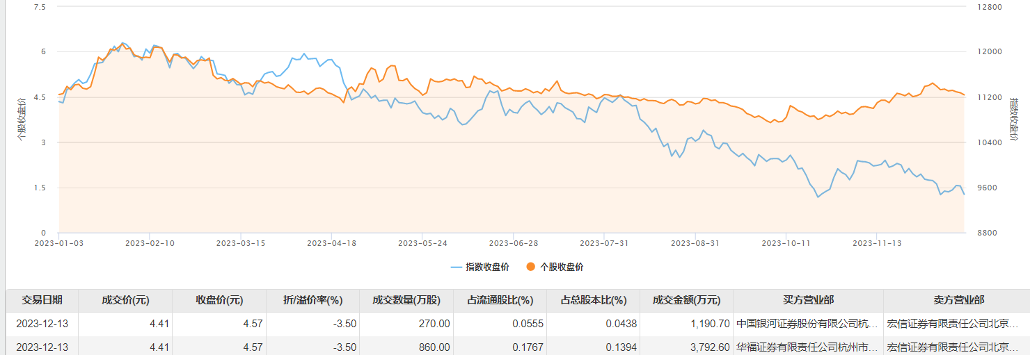 12月13日大宗交易成交1130万股,成交额4983.3万元,占当日总成交额的6.52%,成交价4.41元,较市场收盘价折价3.5%。