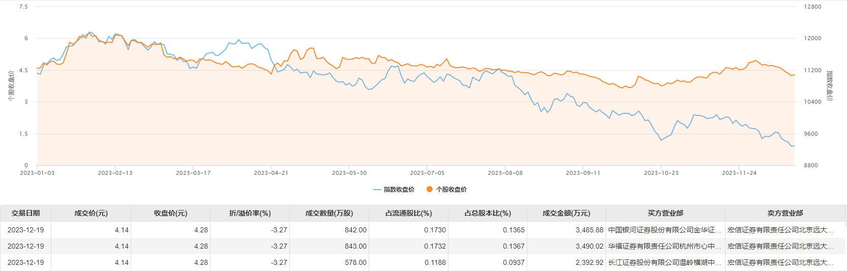 今日大宗交易成交2263万股,成交额9368.82万元,占当日总成交额的20.52%,成交价4.14元,较市场收盘价折价3.27%。