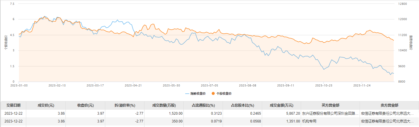 12月22日大宗交易成交1870万股,成交额7218.2万元,占当日总成交额的10.22%,成交价3.86元,较市场收盘价折价2.77%。