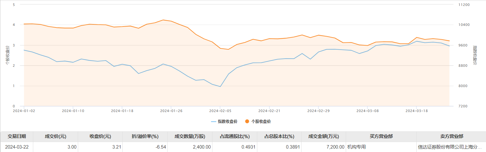 3月22日大宗交易成交2400万股,成交额7200万元,占当日总成交额的8.76%,成交价3元,较市场收盘价3.21元折价6.54%。