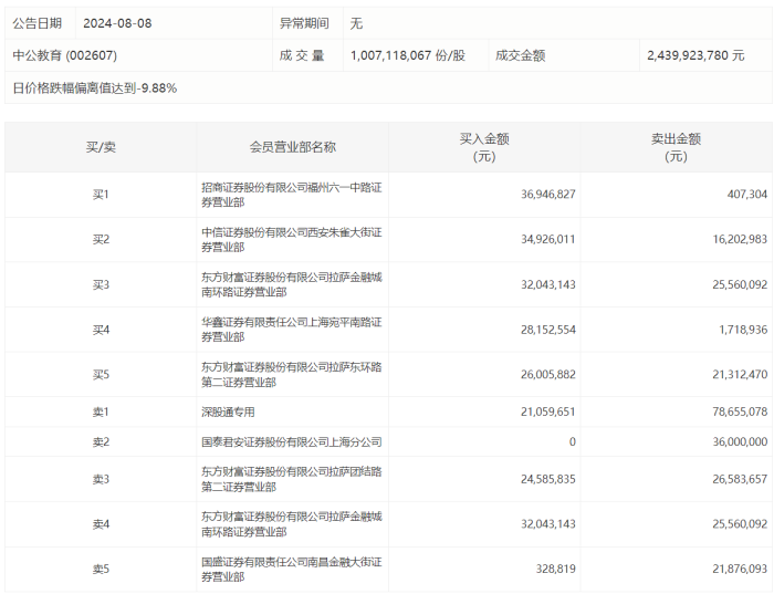 龙虎榜 | 中公教育今日跌停,炒股养家净买入2643.37万元