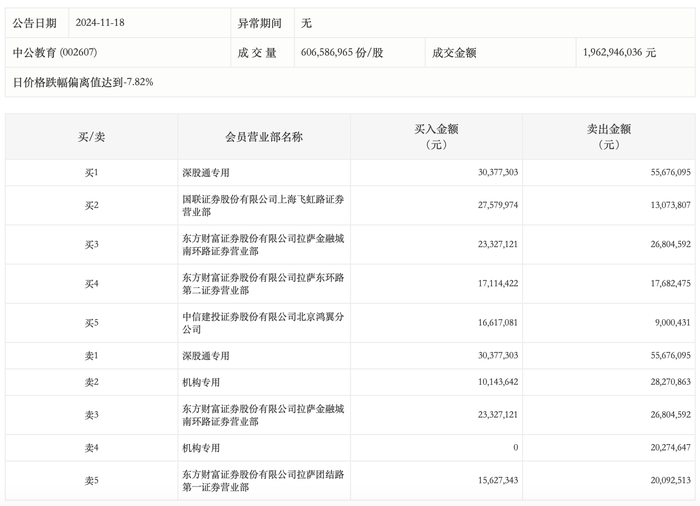 11月18日,中公教育(维权)今日跌停,龙虎榜数据显示,上榜营业部席位全天成交3.32亿元,占当日总成交金额比例为16.9%。其中,买入金额为1.41亿元,卖出金额为1.91亿元,合计净卖出5008.85万元。