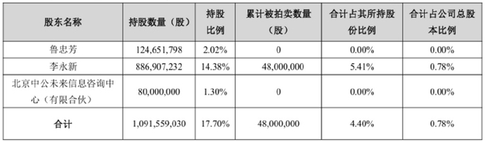 控股股东李永新及其一致行动人鲁忠芳所持股份累计被拍卖情况