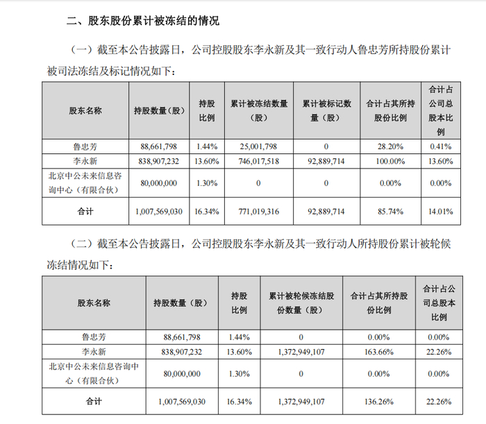 受此影响,李永新累计被轮候冻结的股份数量进一步攀升。截至公告披露日,其累计被轮候冻结股份达13.73亿股,占其所持股份的比例高达136.26%,占公司总股本的22.26%。
