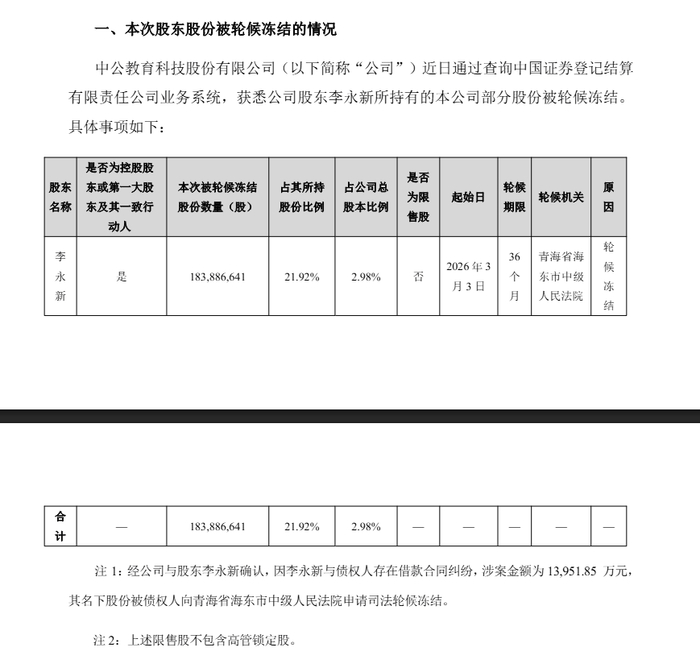 3月6日,中公教育(002607.SZ)发布公告称,公司控股股东李永新所持18388.66万股股份被青海省海东市中级人民法院轮候冻结,占其个人持股总数的21.92%,占公司总股本的2.98%。公告显示,此次冻结系因李永新与债权人存在借款合同纠纷,涉案金额为13951.85万元。