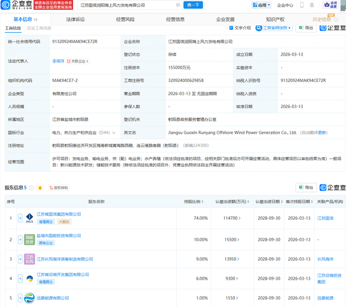 企查查APP显示,近日,江苏国信润阳海上风力发电有限公司成立,法定代表人为李保洋,注册资本为15.5亿元,经营范围包含:发电业务、输电业务、供(配)电业务;水产养殖;新兴能源技术研发;储能技术服务。企查查股权穿透显示,该公司由江苏省国信集团有限公司、盐城市国能投资有限公司等共同持股。