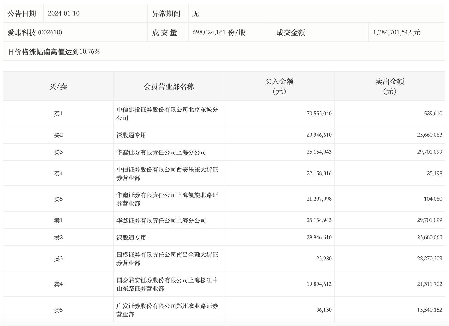 1月10日,爱康科技今日涨停,龙虎榜数据显示,上榜营业部席位全天成交3.04亿元,占当日总成交金额比例为17.05%。其中,买入金额为1.89亿元,卖出金额为1.15亿元,合计净买入7392.79万元。