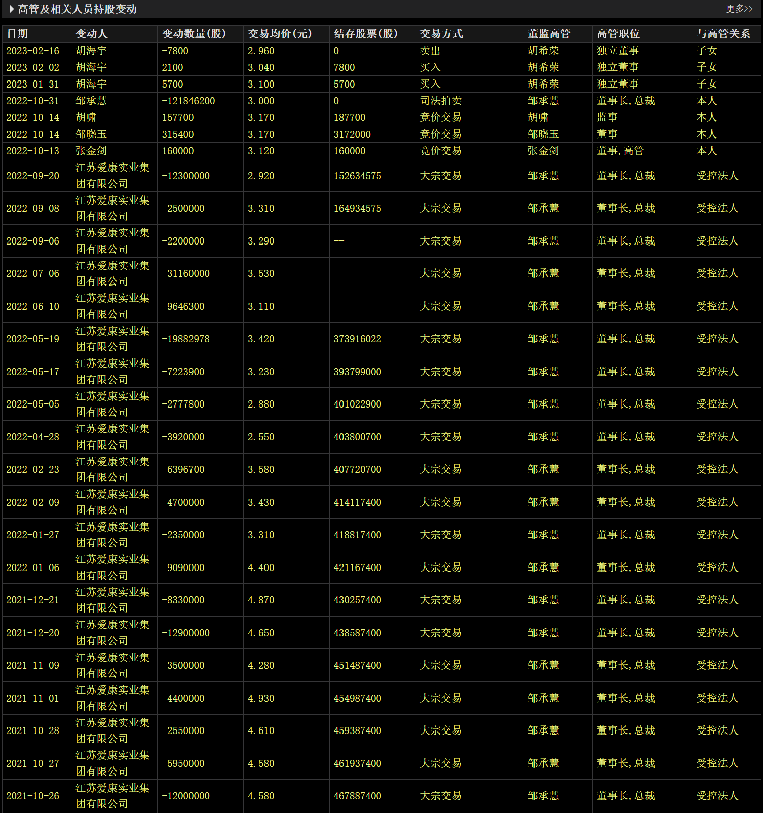 图片来源:choice金融终端通过查询高管持股变动记录发现,邹承慧自2022年10月31日因司法拍卖被动减持1.21亿股公司股票后,其结存股票即为0股。然而再往前推,在更早的2020年6月1日起至2022年9月20日期间,邹承慧所实控的江苏爱康实业集团有限公司通过通过集中竞价、大宗交易、协议转让等方式,合计减持5.22亿股公司股份。
