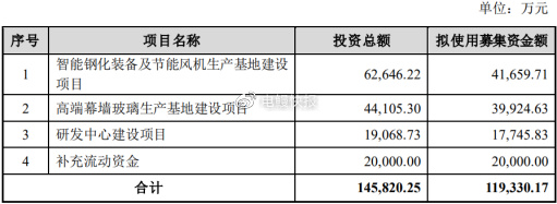 具体募资投向有4个,最大募投项目——智能钢化装备及节能风机生产基地建设项目,投资总额62646.22万元,拟使用募集资金投入41659.71万元,项目建设期24个月,项目将实现具备年产200台(套)玻璃钢化设备及1万台(套)三元流风机设备的生产能力。