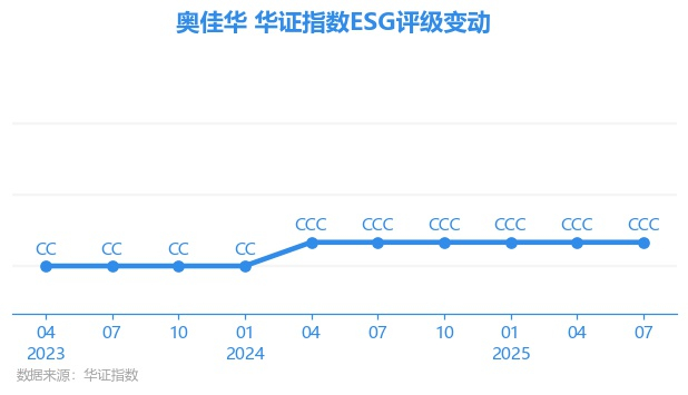 日前,华证指数公布了新一期(2025年7月31日)的ESG评级结果,奥佳华(002614.SZ)获得CCC评级(华证指数评级为C起至AAA九档,C为最低档,AAA为其最高一级评级/AA为其第二档),上一期(2025年4月30日)ESG评级为CCC。本期ESG评级在147家家庭耐用消费品行业A股上市公司中排名第92(上一期排名第85)。