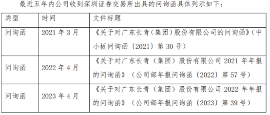 长青集团4月29日披露的《关于公司最近五年被证券监管部门和证券交易所采取监管措施或处罚及整改情况的公告》显示,2022年4月,公司收到《关于对广东长青(集团)股份有限公司2021年年报的问询函》(公司部年报问询函〔2022〕第57号),公司已根据深圳证券交易所相关要求进行了回复或落实。