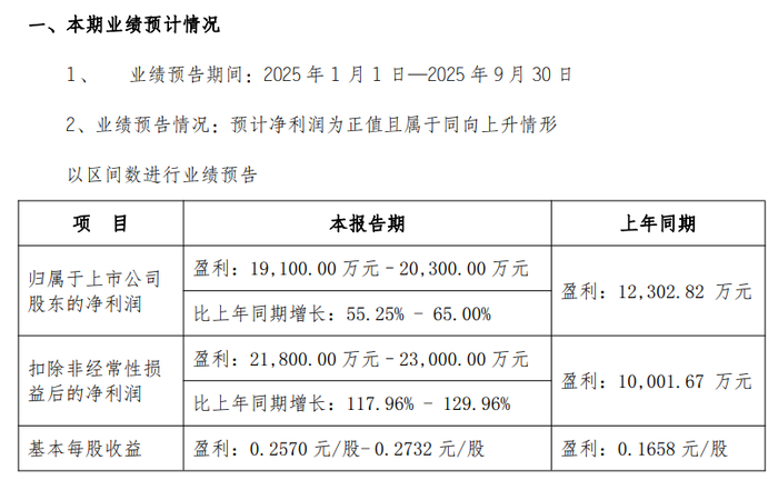 10月19日,长青集团(002616.SZ)披露2025年前三季度业绩预告,公司预计归属于上市公司股东的净利润1.91亿元至2.03亿元,同比增长55.25%至65%;扣除非经常性损益后的净利润2.18亿元至2.3亿元,同比增长117.96%至129.96%。